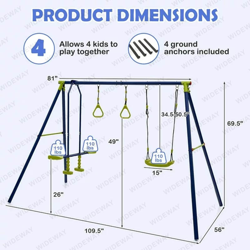 Soláthraíonn an Set Swing Ilfheidhmeach 3-in-1 seo do Backyard áit iontach do na páistí taitneamh a bhaint as a gcuid ama le cairde, rud a bheidh ina bhronntanas foirfe do pháirtithe lá breithe nó féilte. Is féidir leat é a chur sa chúlchlós, sa ghairdín, sa chlós súgartha agus níos mó de réir do riachtanais éagsúla. Agus tá treoracha soiléire ann maidir le suiteáil éasca. Ina theannta sin, tá na crua-earraí riachtanacha go léir lipéadaithe chun do chuid ama agus iarracht a shábháil. Fáilte romhat teagmháil a dhéanamh linn, más mian leat tacair swing a cheannach, is é branda WIDEWAY® do chéad rogha.